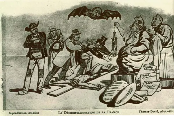 Una tarjeta postal antisemita bretona contra la República: La República está representada por una mujer horrorosa de nariz ganchuda (una judía), y unos políticos profanan el cadáver de Cristo ante unos paisanos bretones indignados.
