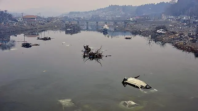 Coches que fueron arrastrados por el tsunami aparecen hundidos en un río en Esennuma