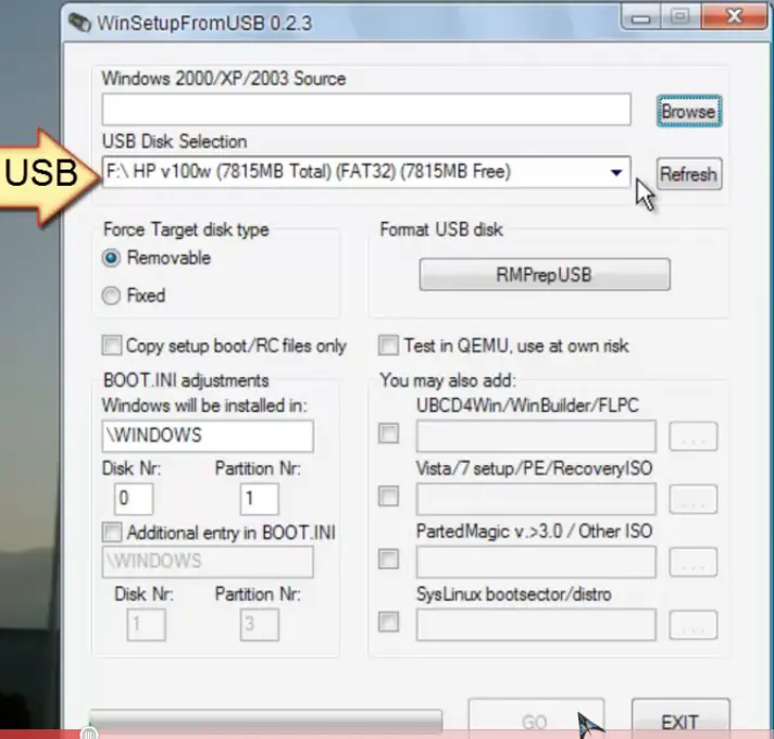 8- Una vez de vuelta a la aplicación WINSETUP FROM USB, presionamos el botón "Refresh" en el ítem " USB Disk Selection.