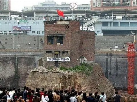 En Chongqing, China, curiosos y visitantes que brindan su apoyo miran la solitaria vivienda rodeada por una gran excavación. Los propietarios de la casa desafiaron una orden judicial que les ordenaba mudarse luego de rechazar la oferta que la gran compañía constructora les ofrecía. La batalla judicial se da en una época en la que en China fue aprobada por la legislatura una una nueva ley de propiedad que protege la propiedad privada. La asombrosa fotografía de la casa solitaria fue tomada el 26 de marzo de 2007 y es un claro ejemplo de la resistencia de un particular frente a grandes intereses económicos.
