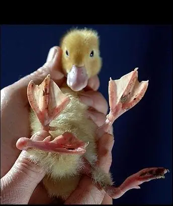 Como se puede apreciar en la asombrosa imágen de abajo se trata de un patito con 4 patas nacido en la Granja Warrawee Duck en Copythorne Hampshire, Inglaterra. Es una rara mutación que dejó al pato con dos patas delante de las dos patas que normalmente tienen. La foto es del día 20 de febrero de 2007.