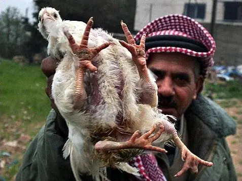 Para evitar las peleas en la mesa familiar a la hora de repartir las patas del pollo, esta impresionante fotografía tomada el 15 de marzo de 2007 muestra una solución. Este granjero de Palestina llamado Mahmoud Abu Znaid sostiene un pollo de cuatro patas en su granja situada en la ciudad de Dura, cerca de Hebron. No hay una explicación clara para esta deformidad y el crecimiento de un par extra de patas ocurre muy raramente, evidenciando que se trata de un accidente en el desarrollo del animal.