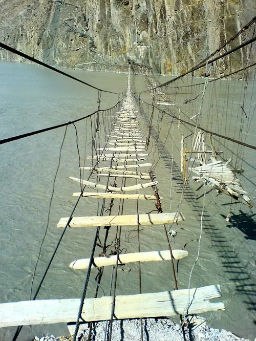 Este puente, que cruza el rió Hunza, es quizás uno de los mas aterradores del mundo entero. En caso que se cuele entre los tablones colocados o escasamente colocados, no hay nada que detenga su caída