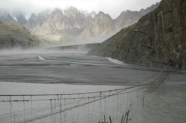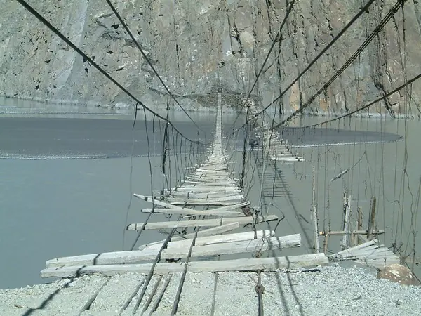 Este puente original fue casi destruido por la inundación que afecto a Pakistán en mayo de 2010 uno de los peores desastres naturales que el país había enfrentado nunca. Ahora el puente original se mantiene, literalmente pendiendo de un hilo, mientras que los viajeros pasan por el puente nuevo igualmente destartalado