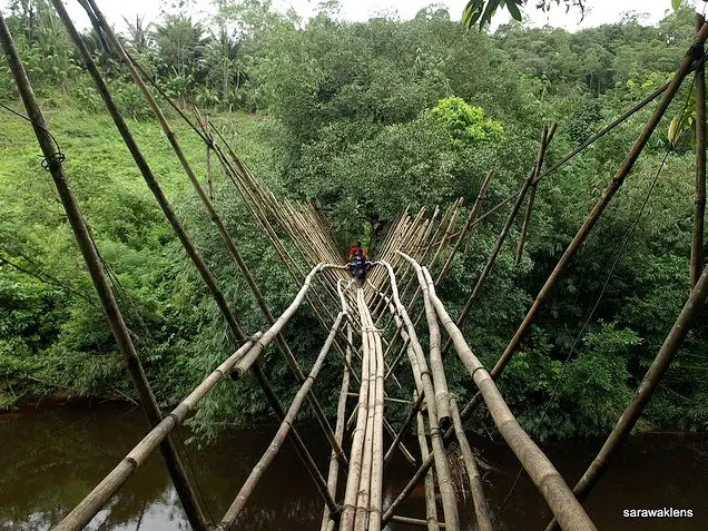 Caminando por la cuerda floja es una cosa, ¿alguna vez te imaginaste caminando por una caña de bambú? Lo puentes de cuerda pueden parecer precarios, pero en esta plataforma usted puede no escaparse de caer completo a través de los huecos de este puente, que ademas es muy fácil que el puente se balancee de un lado a otro. El puente es lo suficientemente fuerte como para sostener a dos personas a la vez, y de hecha los tallos de bambú atados con cuerdas y cables.