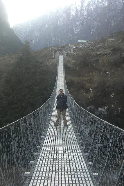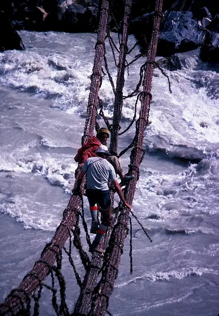 Una vez mas se encuentran en las escarpadas montañas del Himalaya, en el valle Lantang en el Nepal, este puente podria ser seguro, pero una fuerte ráfaga de viento podrían ponerlo al borde de caer desde muy alto sobre grandes piedras