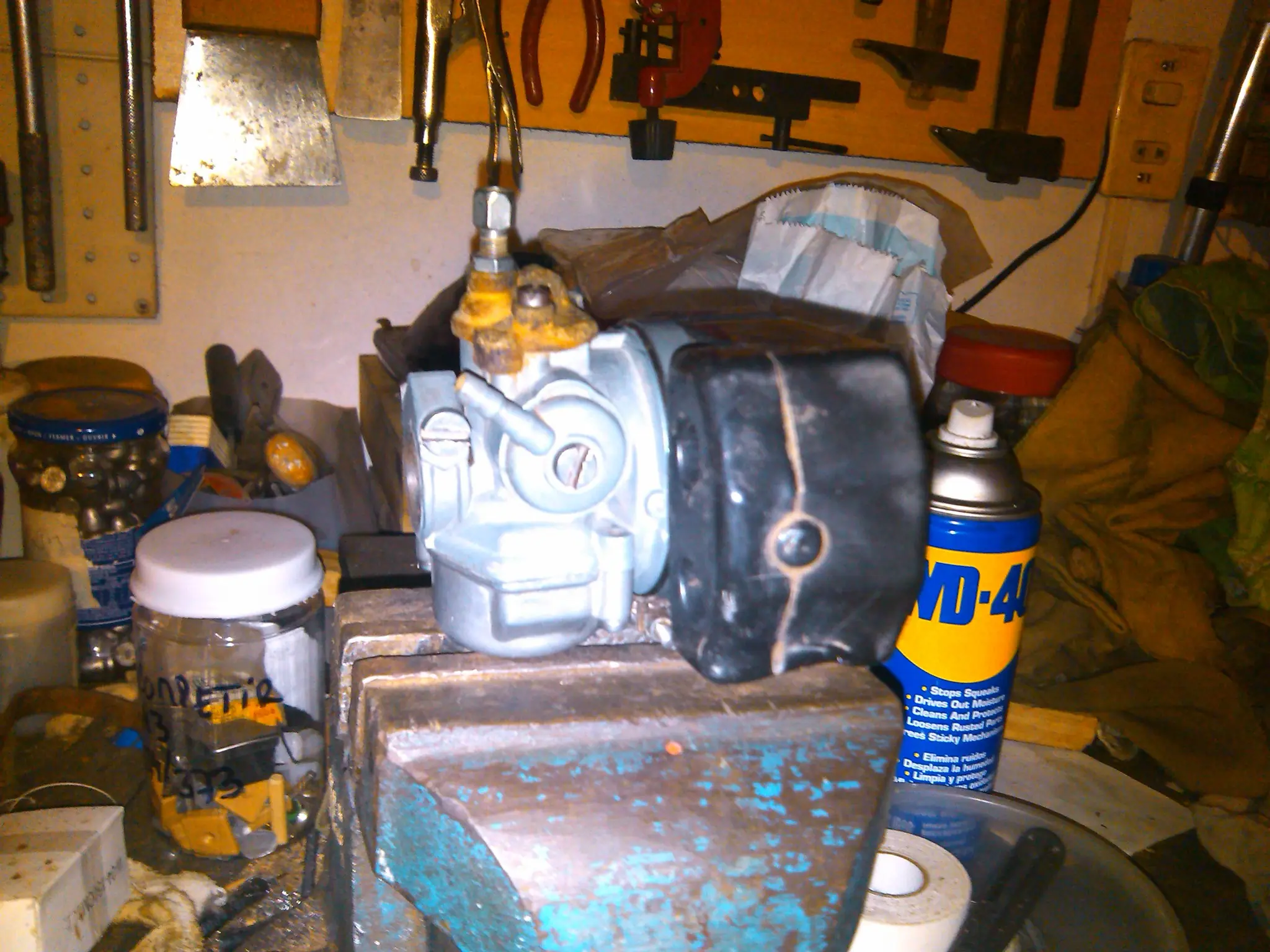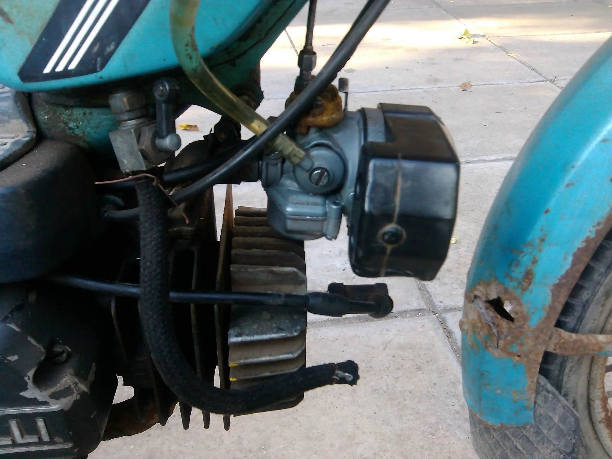 Colocado el carburador, tuve que ponerle un tachito con nafta ya que el tanque esta demasiado sucio. Se verifico que la bujía haga chispa, se limpio y se le dio arranque.