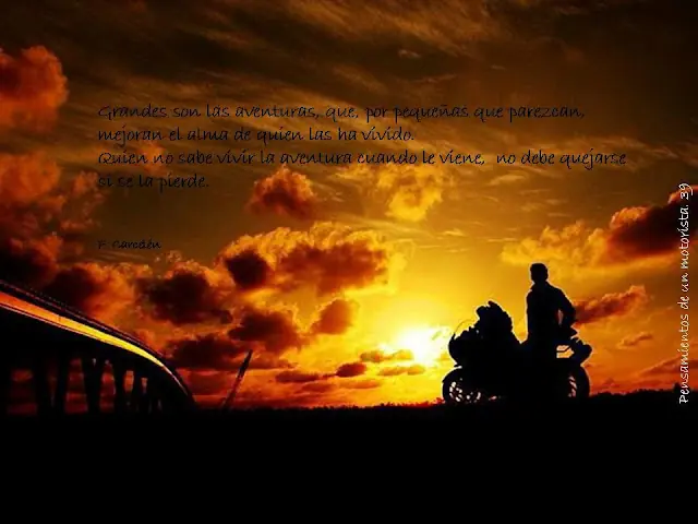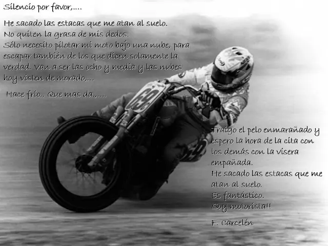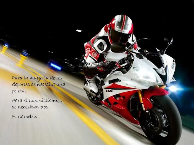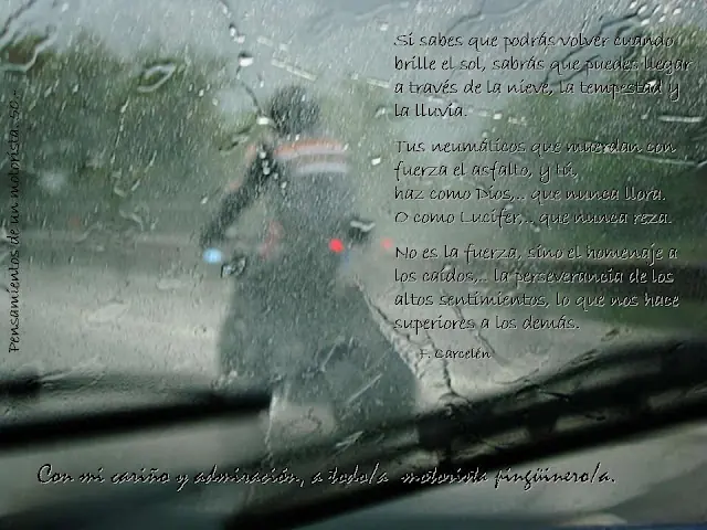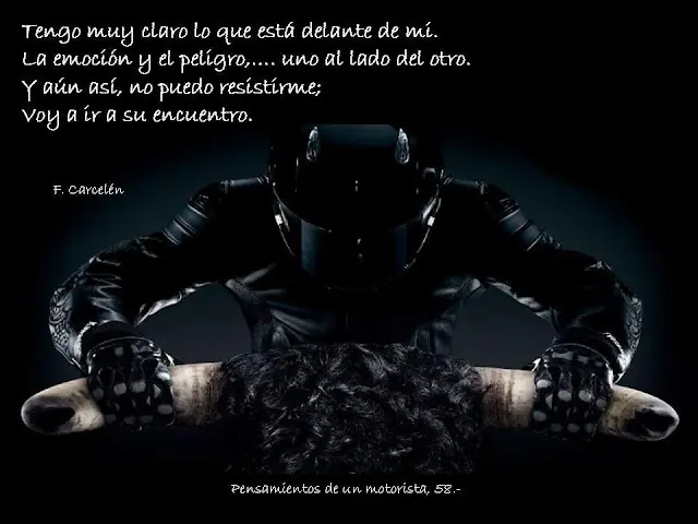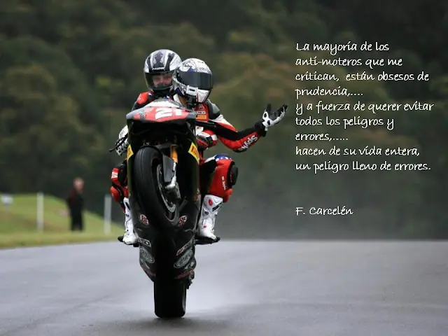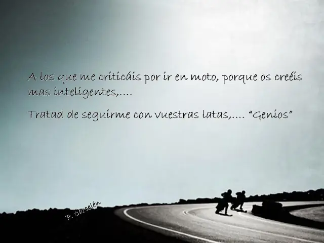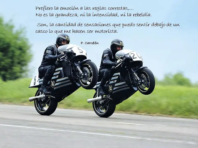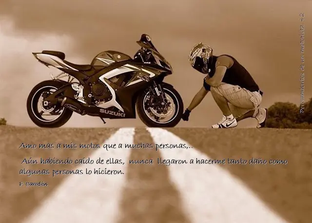 Hola Taringueros! queria compartir con ustedes unas frases sobre aquellas cosas que piensa un motociclista en cuanto a su moto y como ve la vida junto a ella, ademas de siertos valores que se tiene para con su projimo en la ruta o donde sea que monte una moto. Ojala que les guste tanto como a mi como un aficionado a las motos que soy. Sinceramente me llegaron mucho ya que comparto la pasion por las 2 ruedas!!!