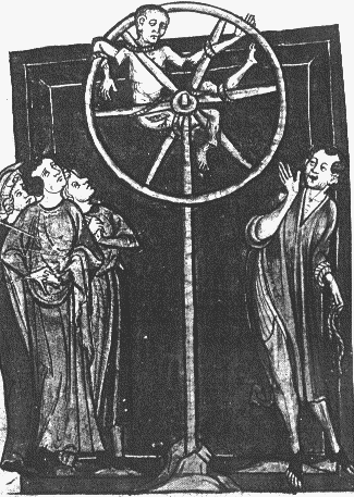 LA RUEDA: Era el más común en la Europa germánica. Convertía al preso, completamente inmovilizado, en verdadero material de trabajo, para que el verdugo fuera descoyuntándole o arrancándole miembros a voluntad. Era uno de los suplicios más horrendos de la Edad Media. El condenado, desnudo, era estirado boca arriba en el suelo, o en el patíbulo, con los miembros extendidos al máximo y atados a estacas o anillas de hierro. Bajo las muñecas, codos, rodillas y caderas se colocaban trozos de madera. El verdugo asestaba golpes violentos a la rueda, machacaba todos los huesos y articulaciones, intentando no dar golpes fatales. Despúes era desatado e introducido entre los radios de la gran rueda horizontal al extremo de un poste que después se alzaba. Los cuervos y otros animales arrancaban tiras de carne y vaciaban las cuencas de los ojos de la víctima, hasta que a ésta le llegaba la muerte.