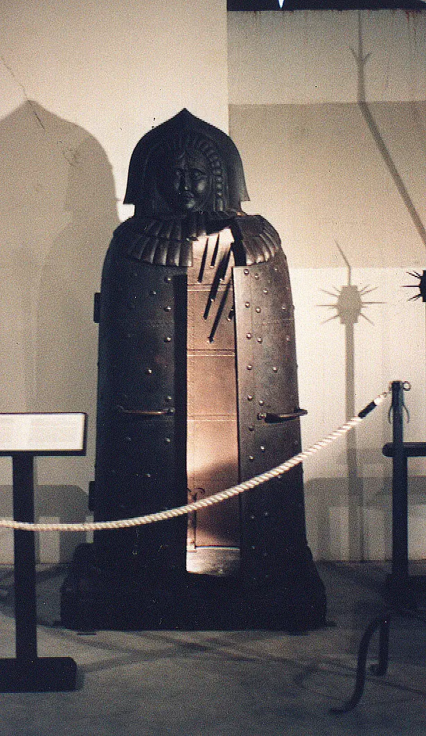 LA DONCELLA DE HIERRO: Aun había otros artilugios como la doncella de hierro, esos ataúdes que eran piezas de exquisita artesanía por fuera y por dentro. Por fuera por la gran cantidad de grabados y relieves que adornaban su superficie; por dentro, por la espectacular colección de pinchos, dirigidos a puntos concretos del cuerpo, que se iban clavando lentamente sobre el inquilino, a medida que se cerraba la puerta. Los clavos eran desmontables, con lo que se podían cambiar de lugar, con el fin de poseer un amplio abanico de posibles mutilaciones y heridas que daban lugar a una muerte más o menos lenta