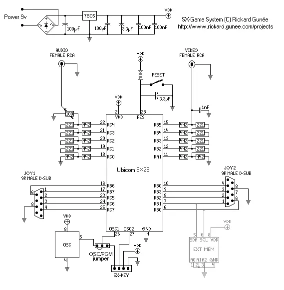 Este sistema funciona con cualquier Joystick de C64/Amiga/Atari (si no tienen no importa que enseño a armarlo). Tiene salida de audio y el procesador es un Ubicom SX28.