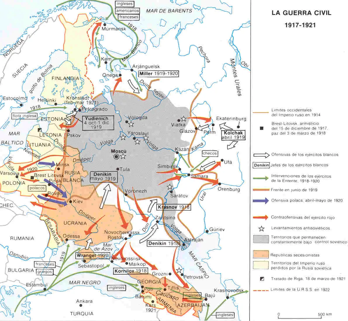 Casi la totalidad de los frentes de la Guerra Civil cesaron en 1920, pero la resistencia continuó en algunas zonas del país hasta 1922; podemos citar el Levantamiento de Kronstadt, los majnovistas la Rebelión de Tambov y la resistencia final del Movimiento Blanco en el Este.