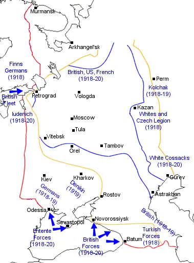 Inglaterra, Francia y Estados Unidos, entre otros, intervinieron del lado de los Blancos. Después de que los aliados derrotaran a los imperios centrales en noviembre de 1918, continuaron su intervención en la guerra contra el bolchevismo por su temor a que la Guerra Civil Rusa derivase en una revolución socialista mundial. Lenin fue sorprendido por el estallido de la guerra civil y, en principio, subestimó las fuerzas que se levantaban en contra del nuevo Estado.