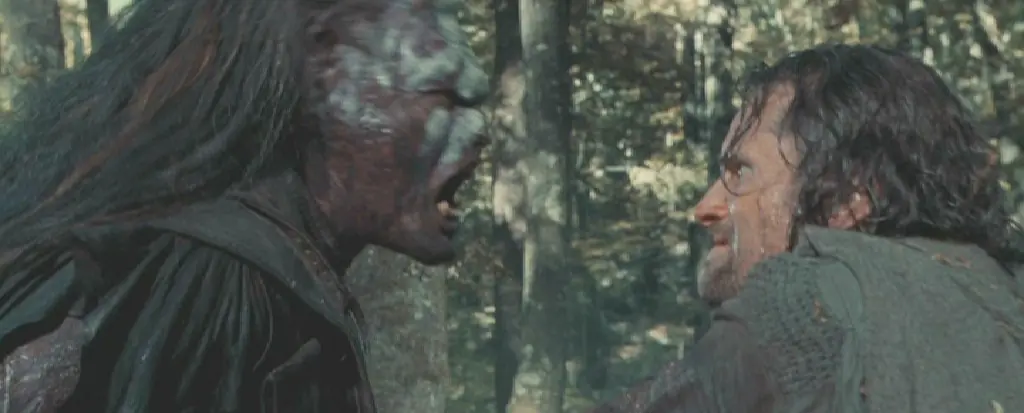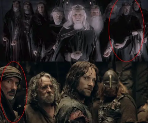 Al final de la película, justo después de cuando Aragorn mata a Lurtz, baja por un pequeño montículo de tierra y se puede observar sin necesidad de camara lenta que un Uruk-hai mueve la mano para que no se la pisase Viggo Mortensen, y el Uruk de al lado levanta la cabeza después de ser pisado por Viggo.