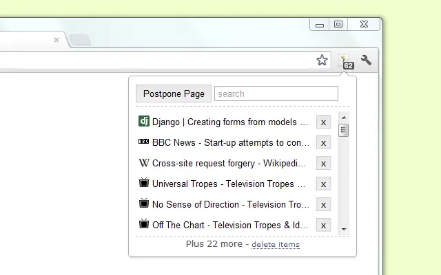 Con Postpone Page podrás salvar y leer tu contenido favorito más tarde. A destacar de esta extensión que es realmente ligera y sencillísima de usar, simplemente con un click salvarás dicha web en la lista creada por la extensión y se cerrará dicha web, podrás consultarla en la lista más tarde cuando quieras.