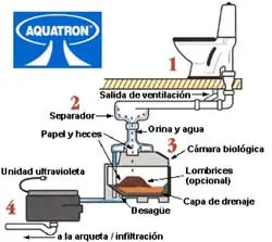 Aquatron funciona con inodoros convencionales (volumen de descarga de 3 a 6 litros) o con modelos separadores de orina que mecánicamente separan la orina del agua y los desechos sólidos en la propia taza. Cuando se descarga la cisterna del inodoro, el agua arrastra el contenido de la taza al Separador Aquatron, donde aproximadamente el 98% de la fracción líquida se separa por efecto del momento, la fuerza centrífuga y la gravedad. El Separador Aquatron no requiere partes móviles. Los componentes separados se tratan de modos diferentes, óptimos para cada tipo de residuo.