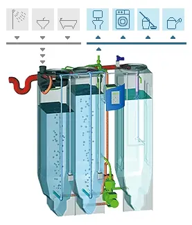 El líquido pasa por la unidad UV, en la que es expuesto a luz Ultravioleta que mata las bacterias y los virus. El líquido puede entonces tratarse como aguas grises (aguas de baño, fregadera y lavandería)