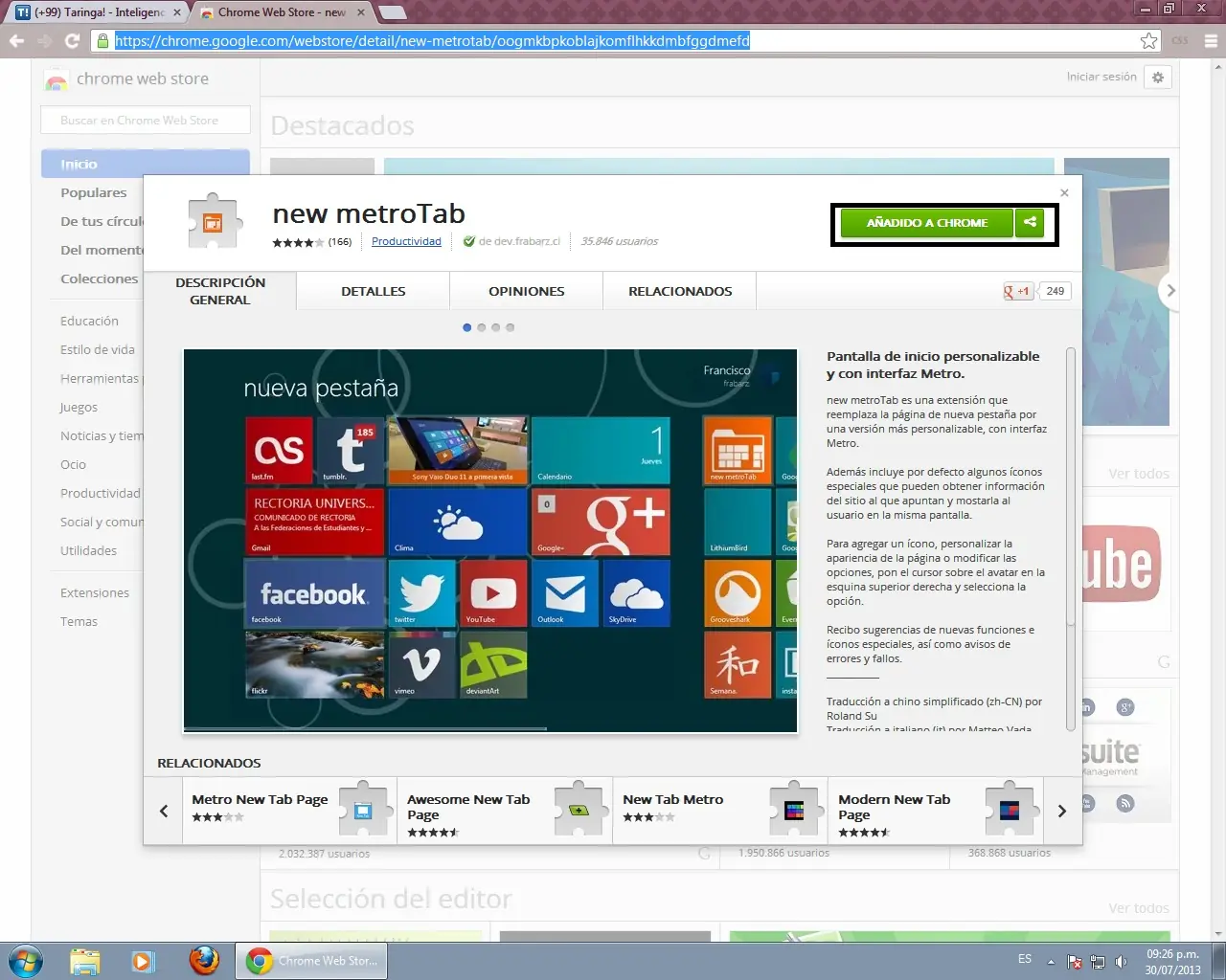 NOTA: A mí me sale "Añadido a Chrome por que ya la instalé. A ustedes les saldrá un botón azul que dice "Añadir a Chrome", lo pican y espera a que la instale. Cuando la instale, abre una nueva pestaña: