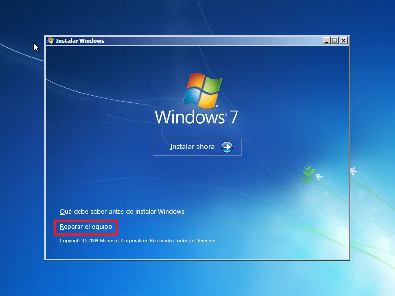 3) Ahora nos saldrá la pantalla con la opción de instalar, pero le daremos a reparar el equipo.