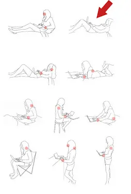 En la siguiente imagen se destacan las zonas del cuerpo que sufren más al utilizar la portátil en distintas posiciones, la posición ideal para la cama se destaca con la flecha: