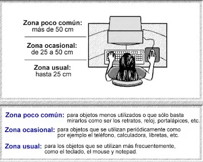 El teclado debe estar a una altura máxima de 20 a 26 cm. entre el muslo y la mano, con el codo y el antebrazo formando un ángulo mayor a 90.