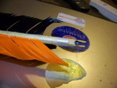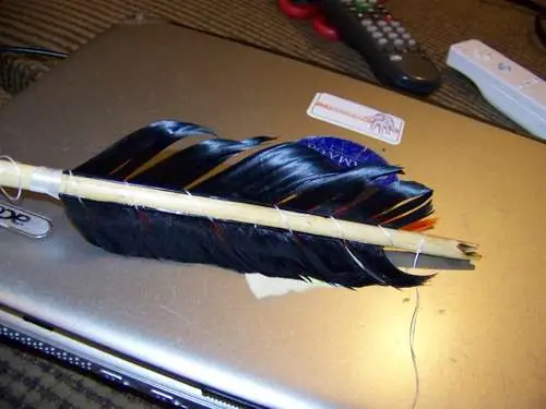 Para sujetarlas vamos a utilizar una cuerda para atarlas. Sería más rápido utilizar pegamento , pero estamos haciendo unas flechas totalmente tradicionales. Observen en la imagen como se ata y como se pasa la cuerda de manera helicoidal a lo largo de las plumas.