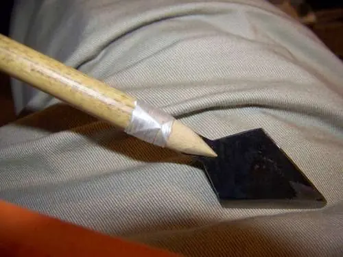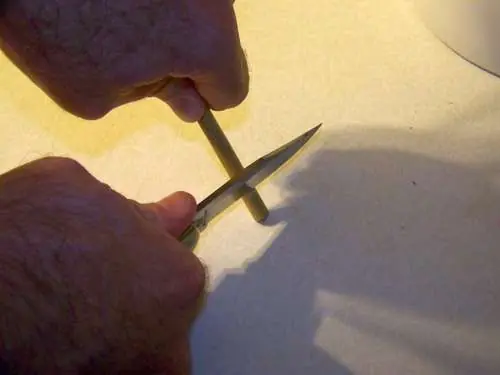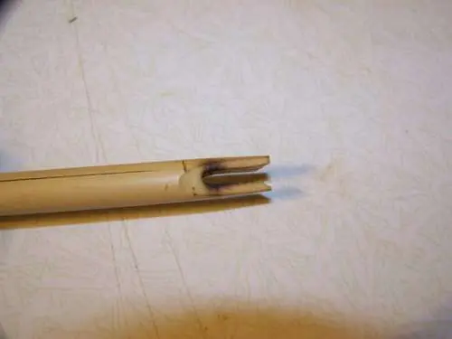 Hacemos una ranura para insertar la punta, ésta deberemos de comprarla o crearla nosotros mismos. En este caso y por seguridad si que pegamos la punta en la ranura, además de atornillarla con el bambú. Luego la recubrimos con hilo de seda para que no pierda el diseño que le hemos dado.