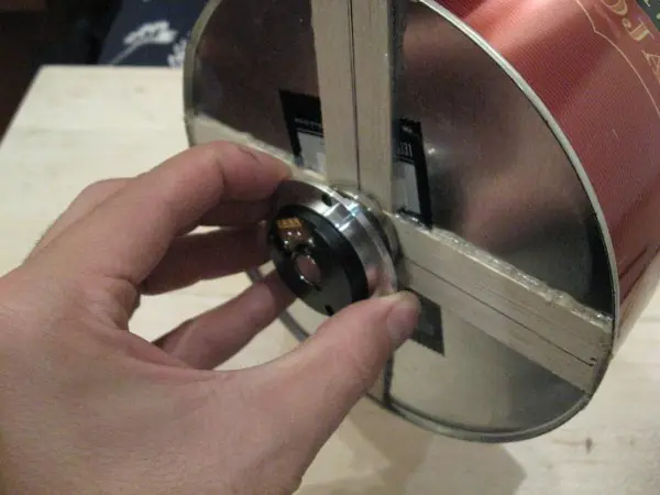 Dependiendo de la lata puede surgir un problema, que sea demasiado endeble y se produzcan vibraciones. Para corregir esto se refuerza toda la base con algún material más rígido. Lo ideal es cortar una superficie circular del tamaño de la base y pegarla. En el tuto han hecho una chapuza con lo que tenían a mano, creando un par de n ervios con madera de balsa.