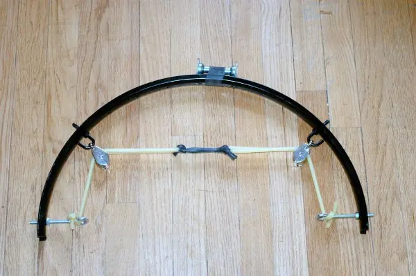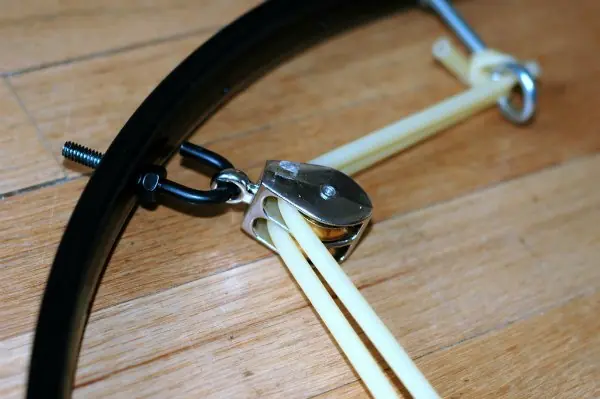 Como ves, se ha pintado el arco, la llanta de bici de negro y se usan poleas y goma de sueropara obtener más potencia.