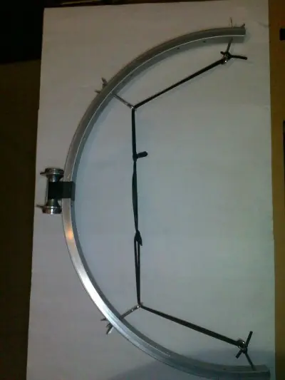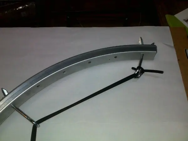 La construcción del arco es muy sencilla. En este caso se trata de una llanta de 29 pulgada que cortamos por la mitad y ala que quitamos los radios. Después de cortar, hay que limar bien los bordes para no cortarte y si pueden, pongan alguna protección.