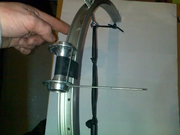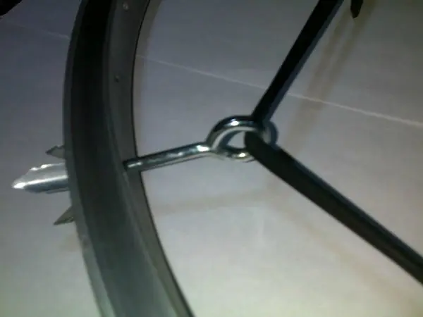 Aprovecharemos los agujeros de los radios para colocar unas alcayatas que nos serviran de tensores para pasar la cuerda del arco, que en este caso va a ser la cámara de la rueda de la bicicleta.