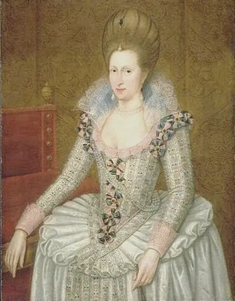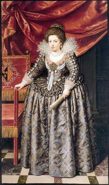 Hacia finales de 1570 se introdujo la versión francesa del "farthingale" que es el que puede ver en la mayoría de los retratos de la Reina Elizabeth. Esta versión consistía de un gran aro horizontal que se llevaba a la altura de la cintura pero inclinado hacia abajo en el frente.