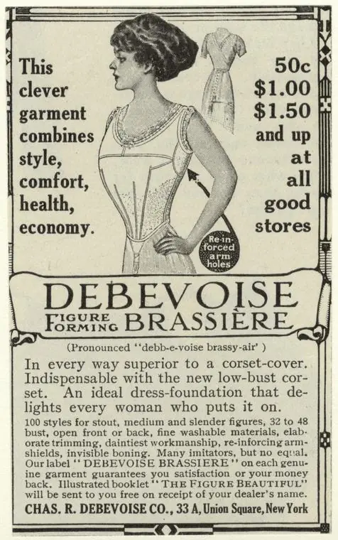 En 1913, Mary Phelps Jacob, luego conocida como Caresse Crosby, afirma haber inventado el corpiño al atar dos pañuelos con una cinta. La lencería poco a poco va dejando de lado la "rigidez" por la suavidad que daba una clara y natural separación entre los pechos.