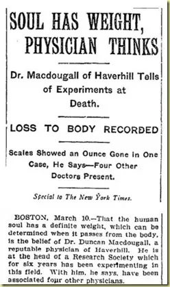 En el New York Times de 1911, cuatro años después del experimento, un periodista publico un artículo donde afirmaba que MacDougall había demostrado que los cuerpos perdían 21 gramos y este peso correspondía al alma.