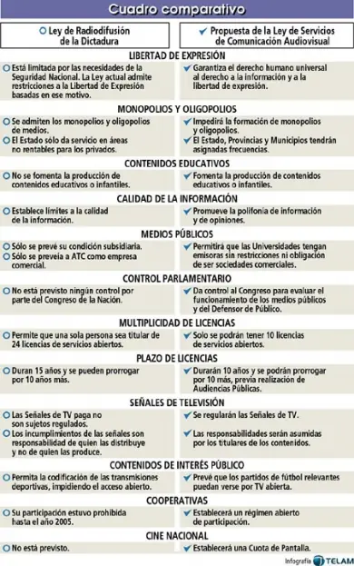 LEY DE SERVICIOS DE COMUNICACION AUDIOVISUAL (Ley de Medios). Terminando con la nefasta ley de la dictadura que Menem empeoró al permitir la formación de Multimedios. Esta ley es de suma importancia en la democracia y permitira que se escuchen otras voces y no solo las opiniones de los dueños de los medios monopólicos que no reflejan la realidad del país sino que muestran lo que a ellos les conviene para sus propios intereses. Esta ley nos da derecho al acceso a la realidad y no a la realidad virtual que nos venden los noticieros y los medios.