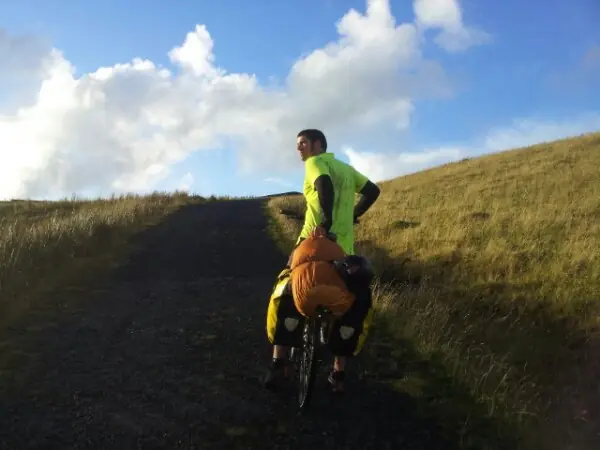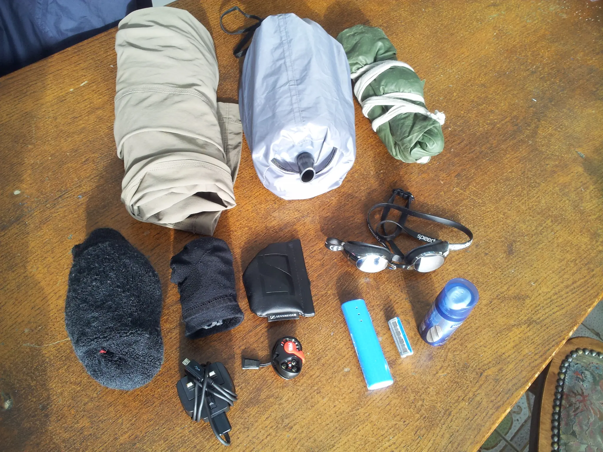 Yo no llevo una muda de ropa, ya que daría más peso y volumen a mi mochila, me las arreglo muy bien con lo que se ve arriba. Si quiero lavar la camiseta amarilla, puedo vestir la camiseta negro térmico en el ínterin. Puedo usar los pantalones mientras estoy lavando los pantalones cortos y vice-versa. En los días más calurosos puedo lavar la ropa interior y volver a ponerlos en forma inmediata - en bicicleta por una hora a que se sequen. El único cambio es que llevo un par de medias extra.
