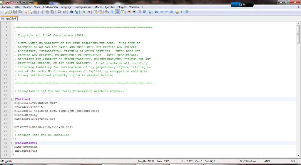 Entramos a la carpeta Graphics y buscamos el INF, en mi caso el archivo se llama igdlh64.inf (el 64 significa 64bits ). Lo abrimos para editarlo.