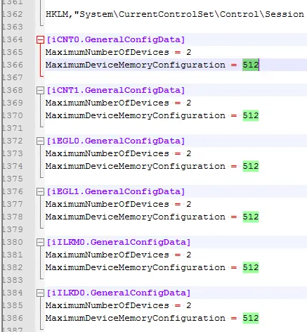 Una vez abierto el INF procederemos a cambiar unos numeros, no es mucha ciencia. Ahora buscaremos las lineas que contengan MaximumDeviceMemoryConfiguration son 6 en total (en algunos casos suelen ser 4). Aca un ejemplo: