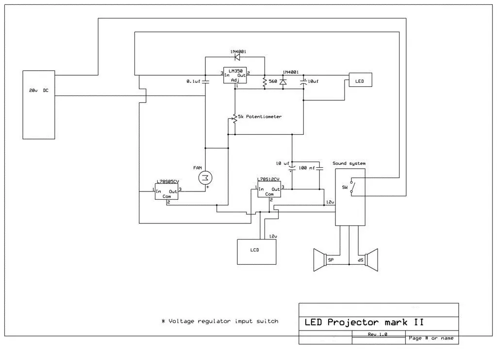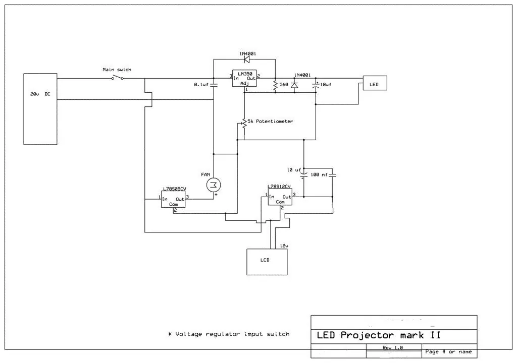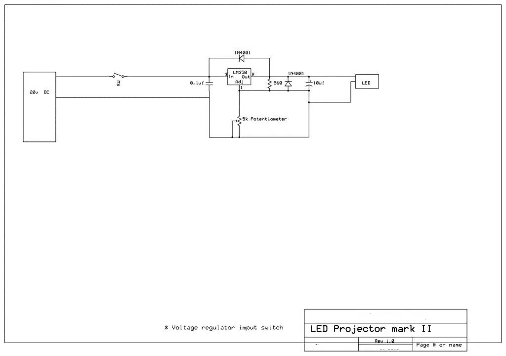 El regulador de voltaje LM350 hace posible que puedas cambiar el voltaje con la resistencia variable de 5k. Conectando un amperímetro podrás ir cambiando el voltaje siempre asegurándote que los amperios no superas a los recomendados por el fabricante del LED.