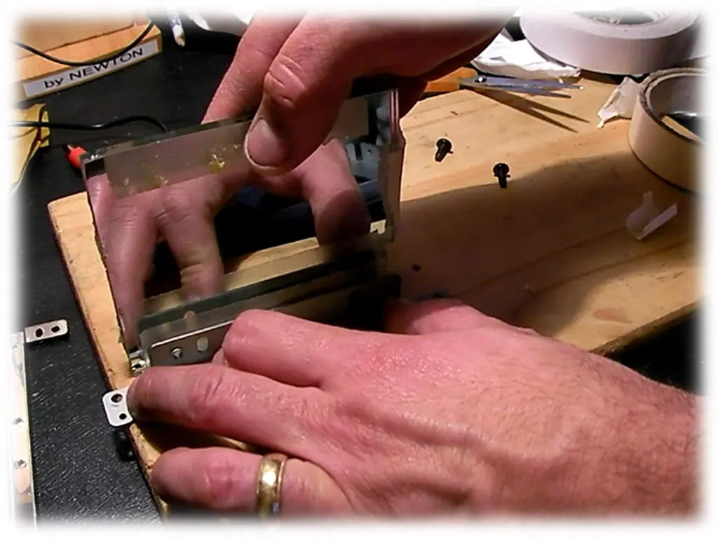 Es muy importante que esto quede bien recto. Mediremos entonces donde queda el centro de la pantalla con relación al soporte de abajo. Esta medido nos servirá para colocar los demás componentes a la misma altura. (El LED con la lente condensadora, y la lente principal o triplet)