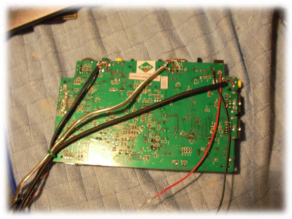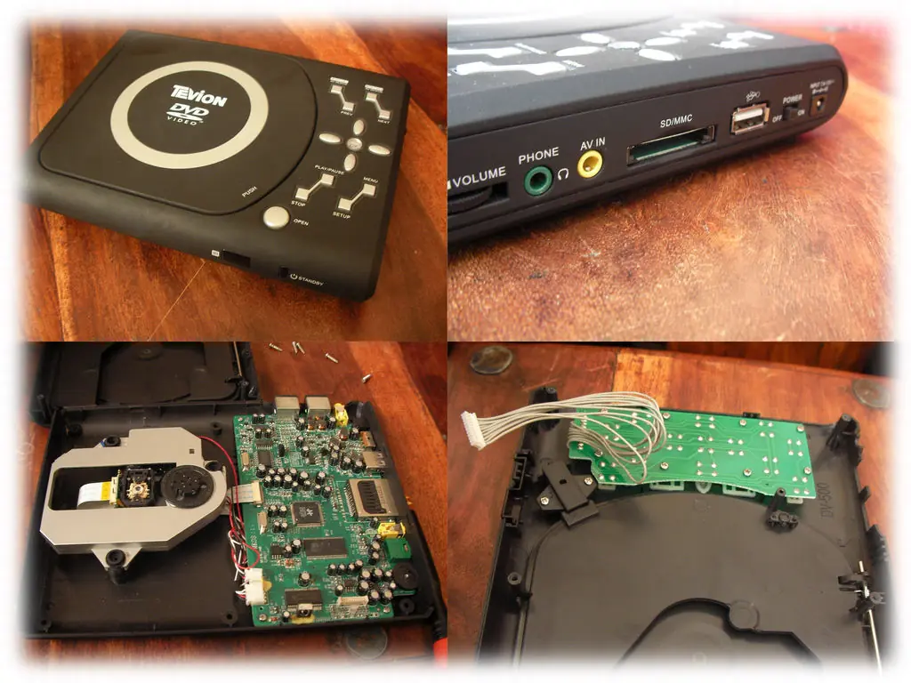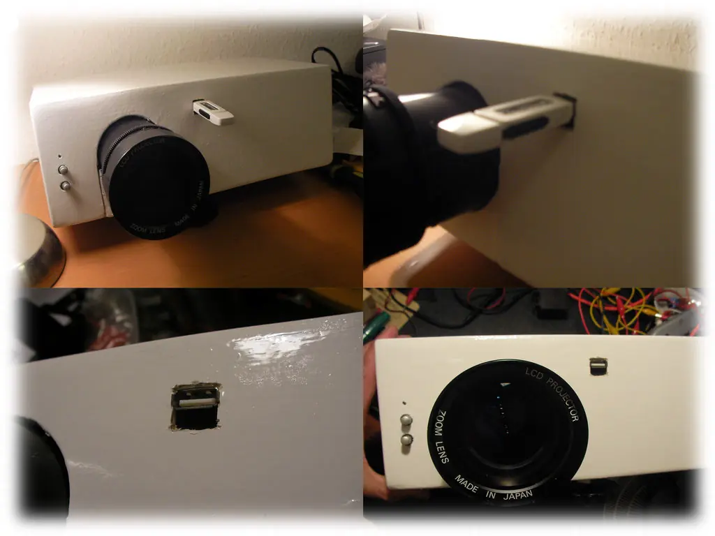 Algunas fotos del reproductor multimedia. Tenía un reproductor portátil de DVD que un día decidió no volver a leer DVD, así que lo destripé y metí dentro del proyector para usarlo como reproductor multimedia mediante la conexión USB