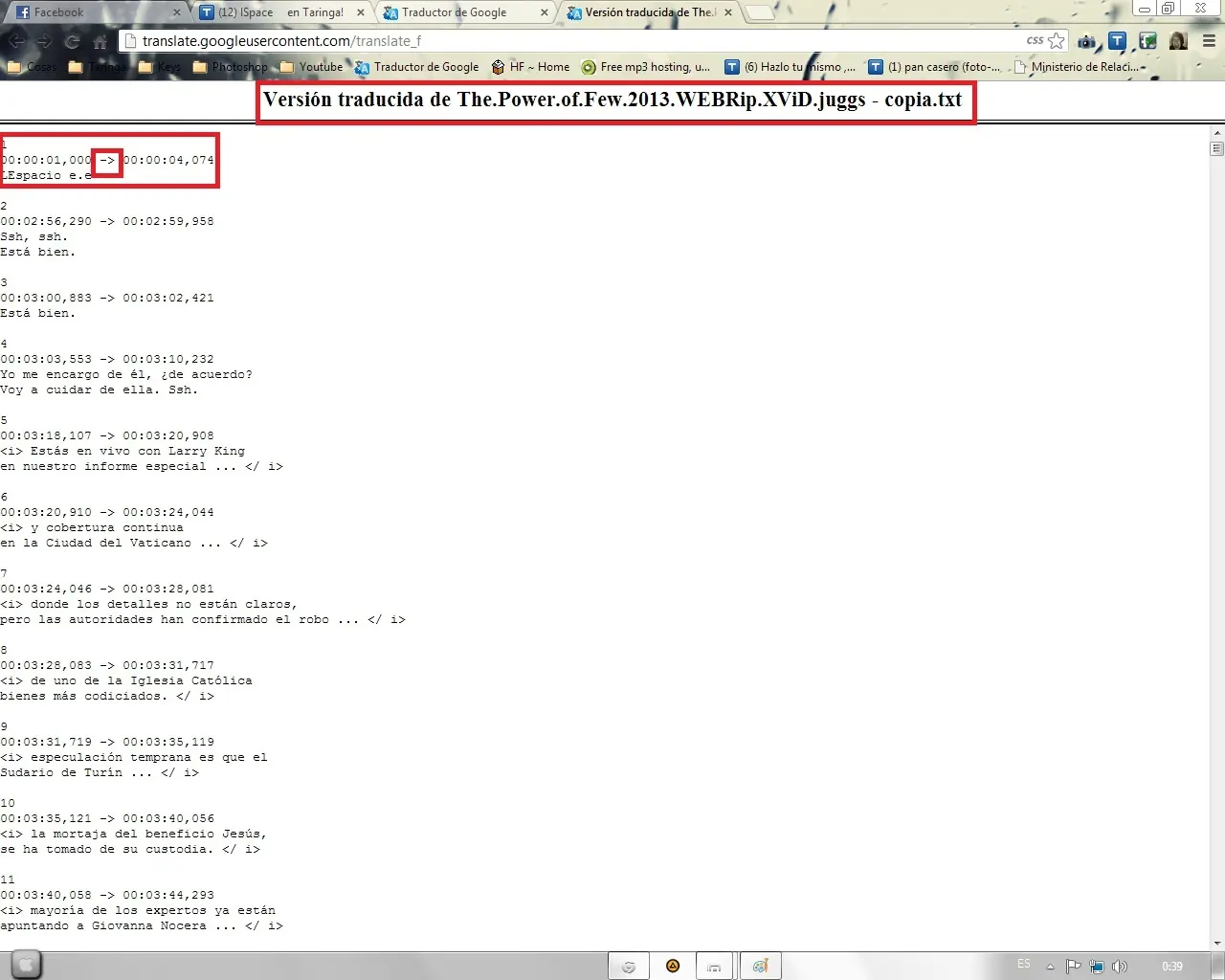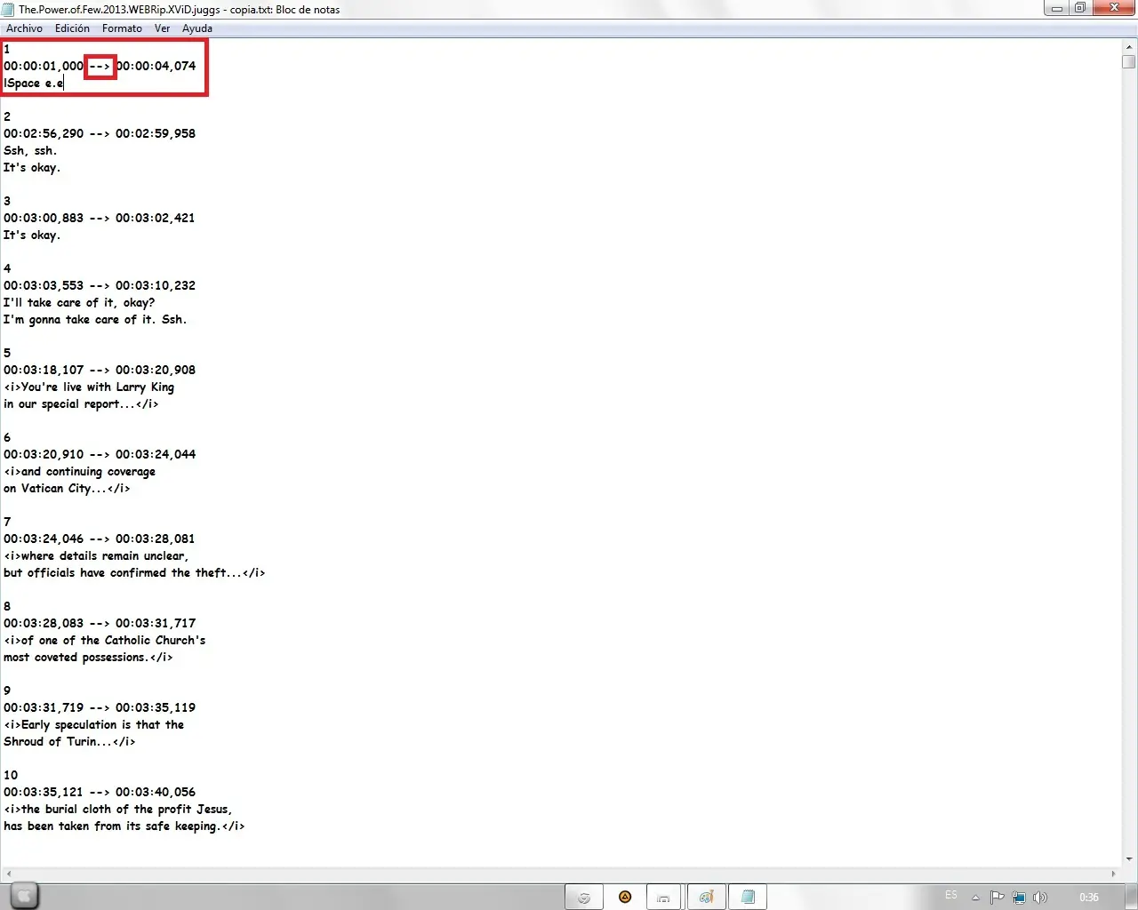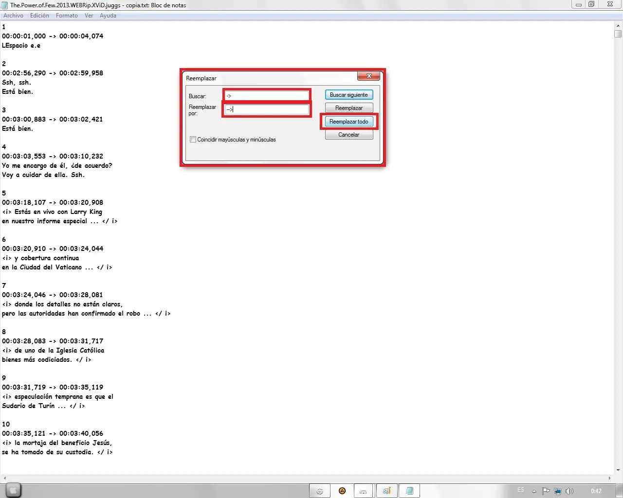 15º Paso: Guardamos el .txt y volvemos a cambiar el .txt a .srt "El archivo traducido es el que dice copia en este caso"
