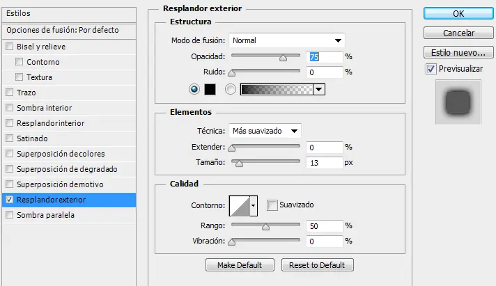 3- Ahora Rasterizamos la Capa del Rectángulo y la Del Triangulo. Las Aclopamos a Ambas y Vamos a Opciones de Fusión. Una vez Allí Vamos a Resplandor Exterior y ponemos los Datos que muestra esta Imagen: