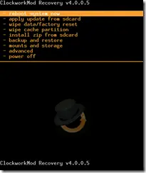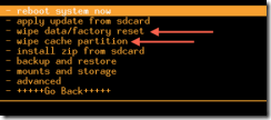 5.- Seleccionamos la opción Wipe data/factory reset y wipe cache partition. El Wipe nos va a borrar todos nuestros datos (pero no el contenido de la SD) por lo que un buen backup antes es imprescindible.