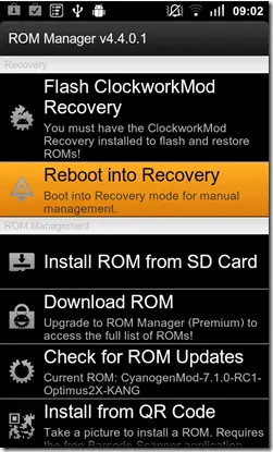3.- Desde el ROM Manager, seleccionamos la opción Reboot into Recovery.