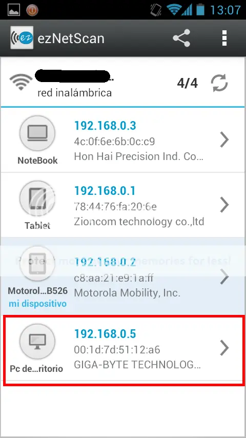 Una vez que escanee nuestra red les aparecera una lista de Dispositivo(s). A ustedes les saldra el nombre de su pc, notebook, o tablet o les dira desconocido pero ustedes pueden ponerle nombre icono en fin, organizarlo. Cuando encuentran Su pc de escritorio le dan click