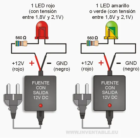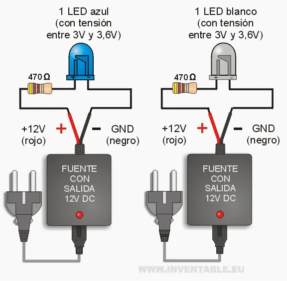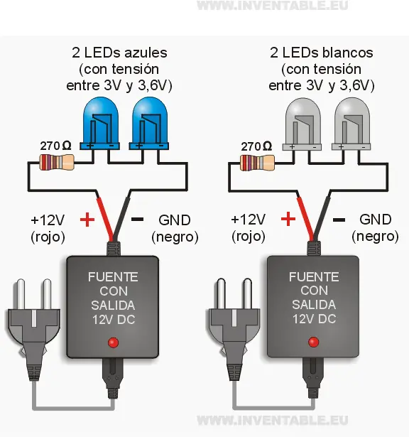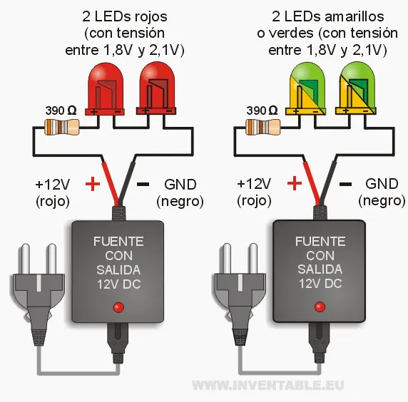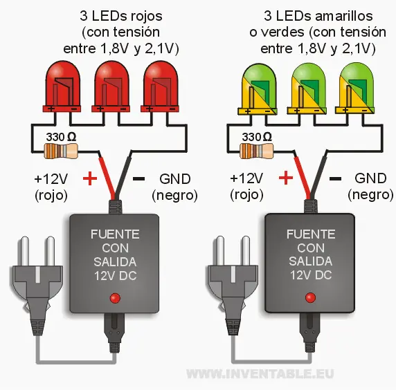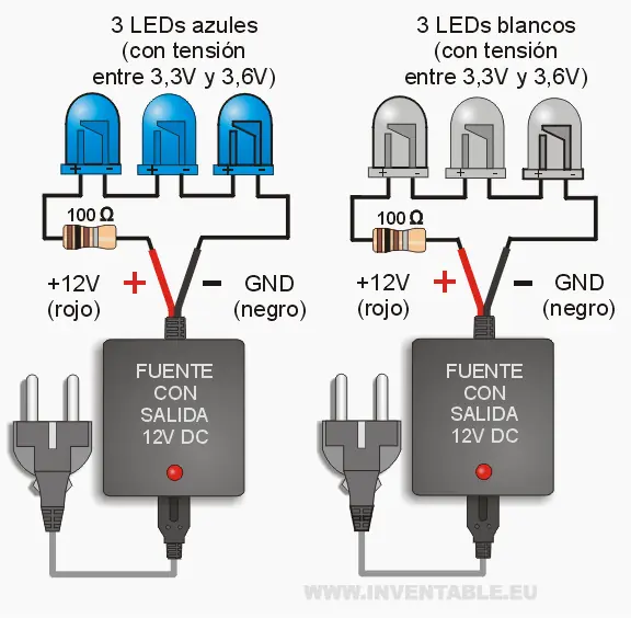 Respecto a los casos con tensiones de alimentación más bajas (5V o 9V), los 12V nos permiten de conectar varios LEDs en serie como pueden observar en los diseños (hasta 3 led azules o blancos y hasta 4 LEDs rojos, verdes o amarillos) mejorando el rendimiento y simplificando las conexiones porque se necesita solamente una resistencia.