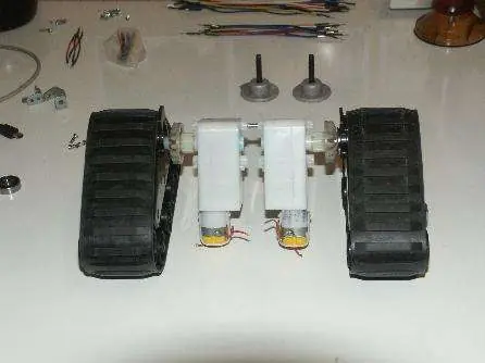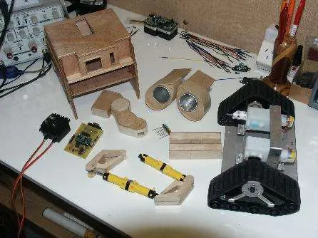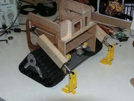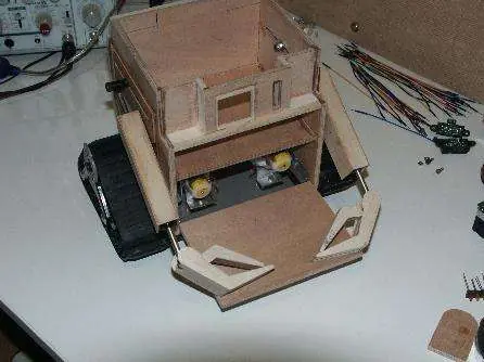 Utiliza un par de MATTRACKS para la fuerza motriz y dos robosapienV2 para la cadera motores. Será controlado por una CPU marca BS2P40 y tendrá las siguientes funciones que se describen a continuación. que construir robots muy prolífico. La razón principal para la construcción de este proyecto era para ver si podía usar las piezas de mi stock de los componentes que he acostado alrededor de mi sótano y sala de electrónica, lo único hasta ahora que he tenido que comprar es el MATTRACKS, pantalla de uOLED y L298 IC H-puente.