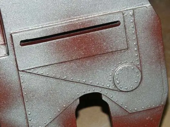 Lo más importante de Wall-E : es de 5 mm Lite capas, laterales, frontal, posterior y superior, con 2 mm de balsa de revestimiento en los lados con un poco de 1.5mm capas para formar los paneles levantados. Los remaches se realizaron con cola blanca diluida al 40% y se aplica al área requerida es con una vara afilada y puntiaguda, una caída le dará 3 remaches.