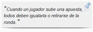 En cada ronda de una mano se van colocando apuestas, en orden. Comienza el jugador a la derecha de quien ha repartido las cartas. Si el jugador apuesta, el siguiente debe igualar o subir la apuesta, o bien retirarse de la ronda de juegos y entregar sus cartas.